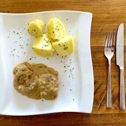 • Schnittlauch zur Soße und Petersilie über die gekochten Kartoffeln geben.