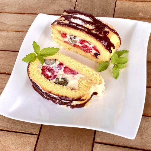 • Die Roulade wird für mindestens 30 Minuten gekühlt und dann mit Staubzucker bestreut. Auf Wunsch noch geschmolzene Schokolade darauf geben.