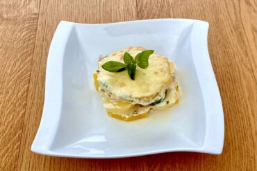• Die Roulade mithilfe vom Geschirrtuch einrollen. Eingerollt liegen lassen.