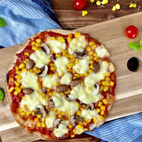 - Den Mais und Mozzarella auf der Teigtasche verteilen.