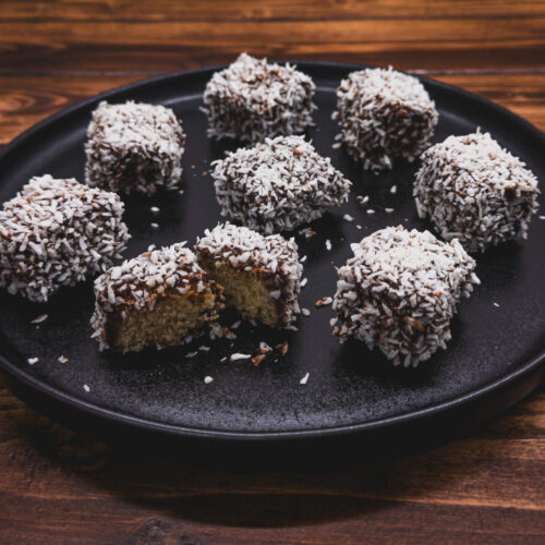 - Dann die Kuchenstücke zuerst in die Schokolade tunken und nun in die Kokosflocken geben.