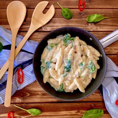 • Nun Frischkäse und Milch dazugeben und umrühren, bis die Soße cremig wird.