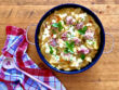 • Wasser, Suppenwürfel, Zwiebel und Knoblauchzehe in den Bräter geben.