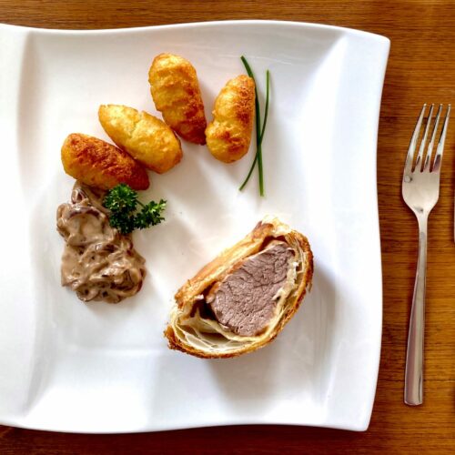 Schweinefilet im Blätterteigmantel mit Kroketten und Zwiebelsoße