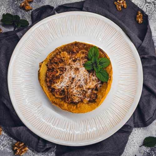 Spaghetti-Kürbis mit Walnuss-Champignon-Bolognese