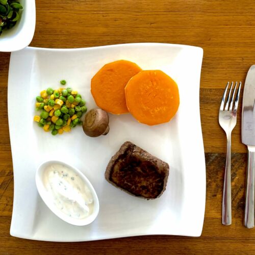 Steak mit Kürbisscheiben, Gemüse und Joghurtsoße