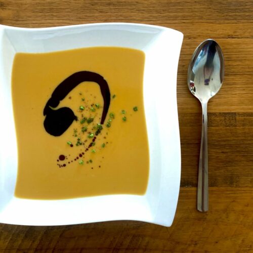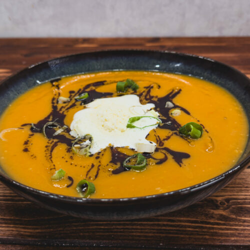 • Die Süßkartoffeln und Zwiebeln schälen und in grobe Stücke schneiden.