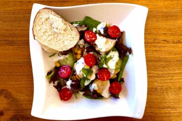 • Frischkäse, Creme Fraiche, Naturjoghurt, Schnittlauch, Salz, Pfeffer, Paprikapulver und den Mozzarella Käse vermischen.
