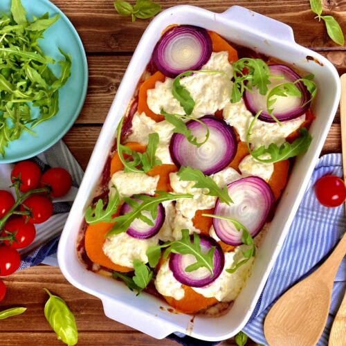 • Abschließen kann man mit einer Süßkartoffelschicht oder einer Speck-Zwiebel-Schicht aufhören.