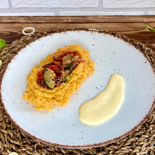 Süßkartoffelpüree mit Röstgemüse und cremiger Soße