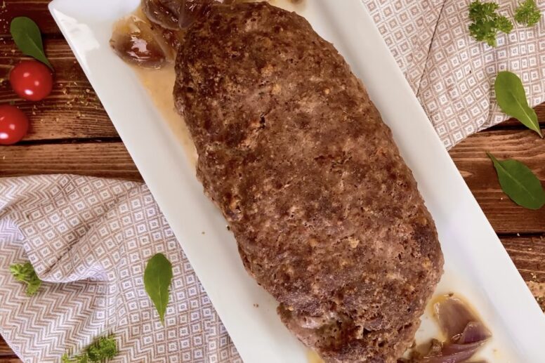 Faschierter Braten mit Kartoffelpüree und gerösteten Zwiebeln