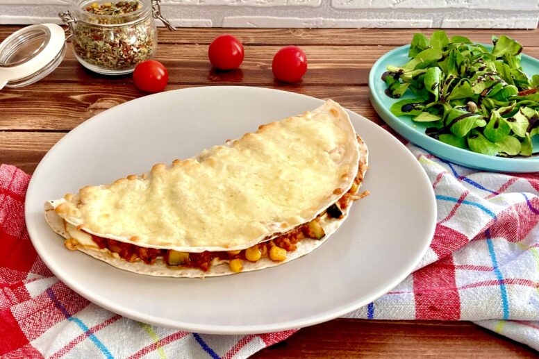 Überbackene Teigtasche gefüllt mit tomatiger Sojafaschierten Soße