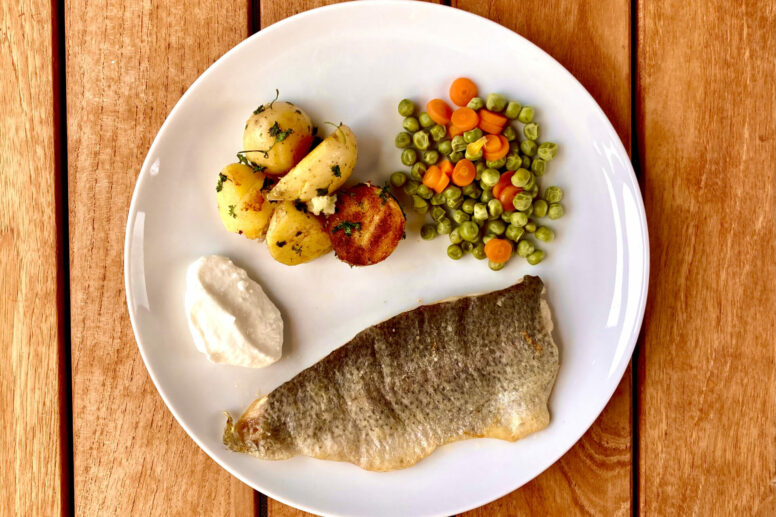 Fisch mit Petersilienkartoffeln, Gemüse und Krensoße