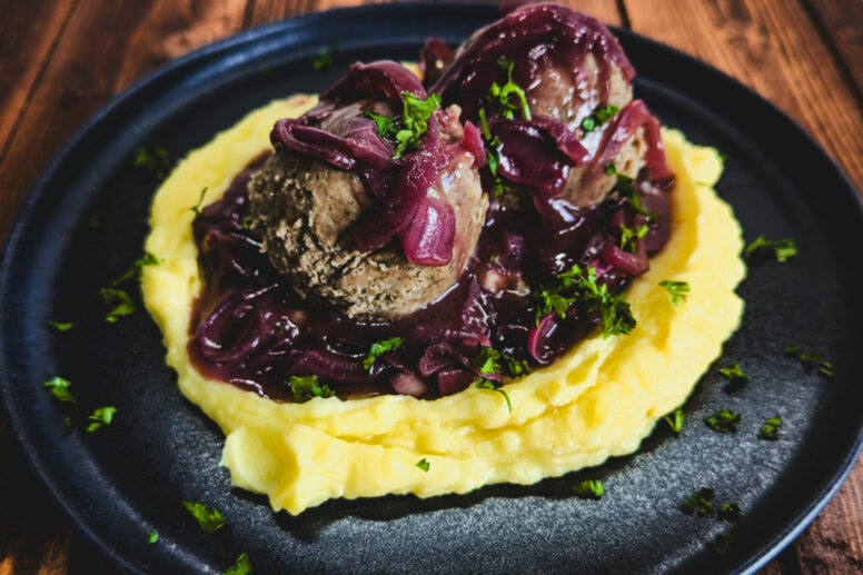 Leberknödel mit Zwiebelsoße, Kartoffelpüree und Sauerkraut