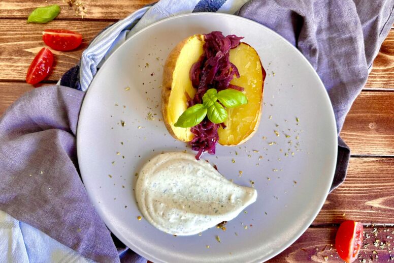 Ofenkartoffel mit Röstzwiebel und Joghurt -Sauerrahmsoße