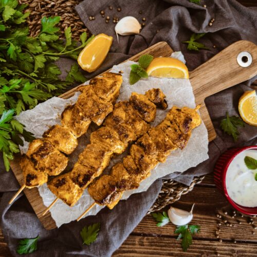 Tandoori Chicken Spieße vom Grill & Minz-Dip