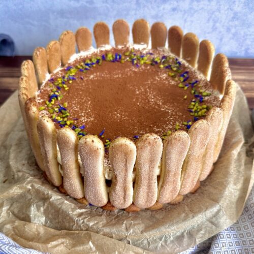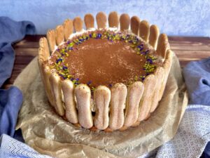 - Für die Biskotten am Rand nur eine Seite ganz kurz in den Kaffee tunken und in die Form schlichten. Man kann wahrscheinlich nur wenige Biskotten am Rand schlichten, dann muss man die Creme schon etwas verteilen, damit die Biskotten nicht umfallen. So lange machen, bis alle Biskotten am Rand verteilt sind und die Hälfte der Creme verbraucht ist.