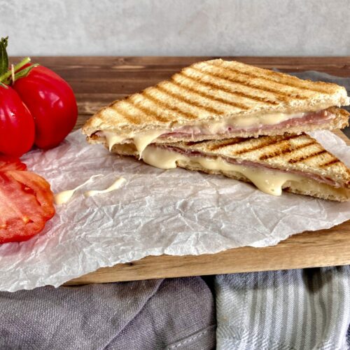 - Zweite Scheibe Toastbrot drauf und in einem Paninimaker anbraten bis es knusprig ist. (Falls kein Paninimaker zu Hause verfügbar ist, kann man auch einfach beide Scheiben Toastbrot getrennt belegen und dann alles im Backrohr bei 200 Grad Celsius backen bis es knusprig ist)