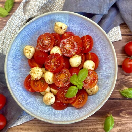 • Die Tomaten in Stücke schneiden oder je nach Größe nur halbieren.