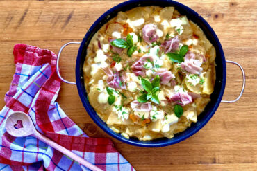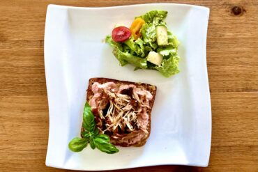 • Mit Salz, Pfeffer, Salatkräuter, Balsamicoessig, Olivenöl abmachen.