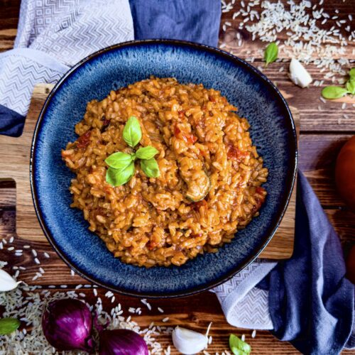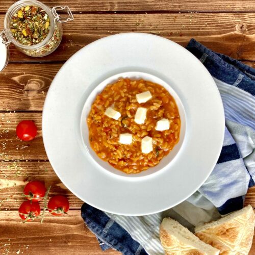 - Alles ca. 30 Minuten garen lassen, immer wieder umrühren und immer wieder mit Suppe aufgießen, bis am Ende keine Suppe mehr da ist.