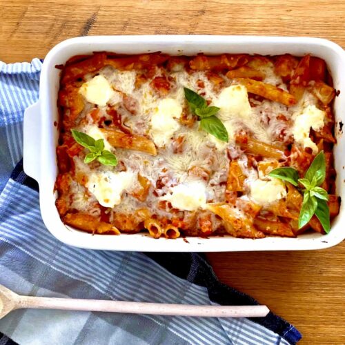 • Die Hälfte der Nudelmischung in die Auflaufform geben. Die Hälfte vom Creme Fraiche löffelweise darauf verteilen und mit der Hälfte vom Mozzarella bestreuen.
