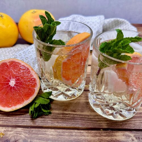 - Dann mit Tonic Water aufgießen und Rosmarin oder Minze ins Glas stecken.
