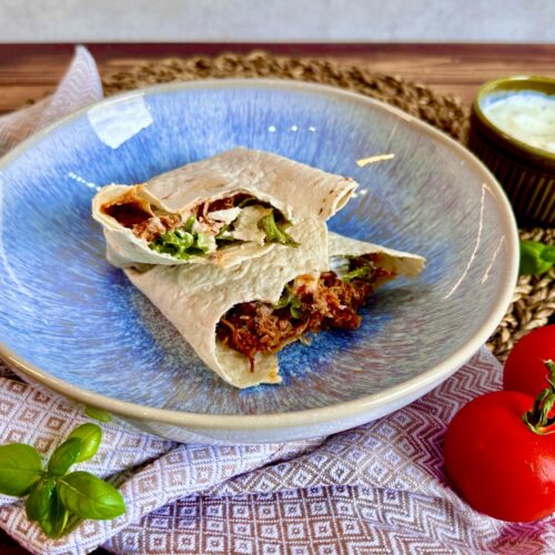 - Auf der Tortilla Teigtasche die Tofu Füllung, Salat, Feta und Soße verteilen.
