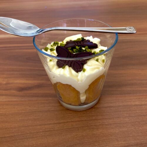 • Die Biskotten tränken und seitlich ins Glas schichten.