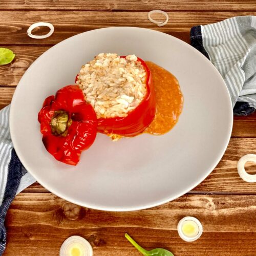 - Diese Masse in die Paprika füllen und den Deckel vom Paprika obendrauf setzen.