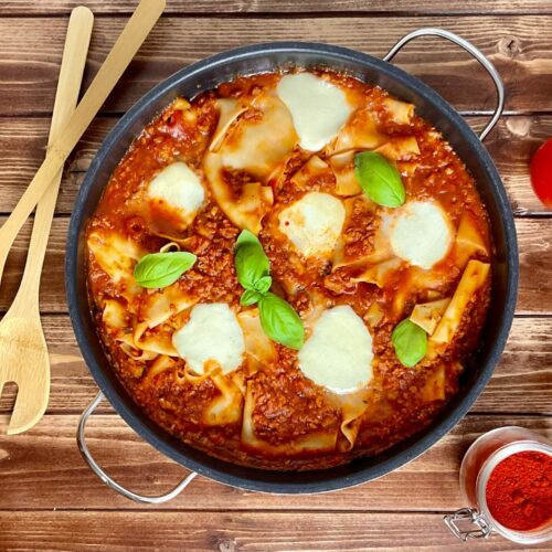 - Die gekochten Lasagneblätter in die Soße einrühren.