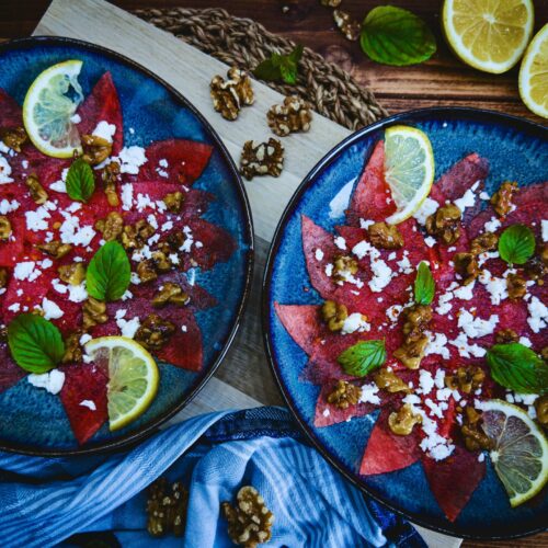 Wassermelonen Carpaccio mit karamellisierten Walnüssen & Feta
